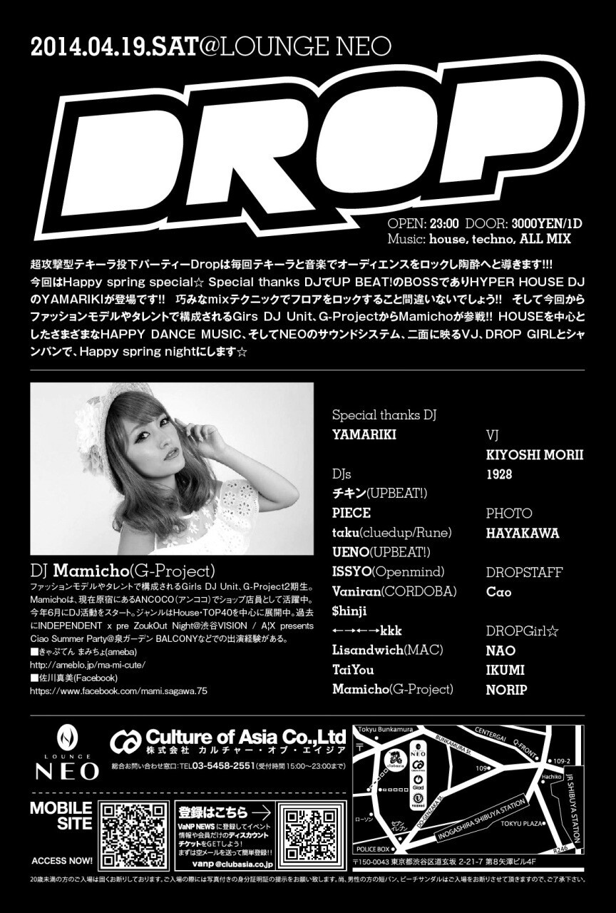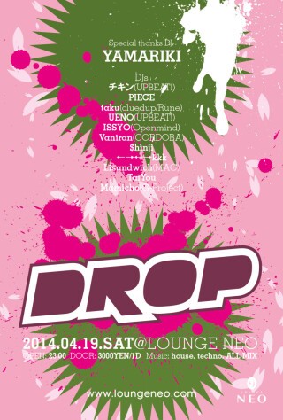 HOUSEを中心としたさまざまなHAPPY DANCE MUSIC、そしてNEOのサウンドシステム、二面に映るVJ、DROP GIRLとシャンパンで、Happy spring nightにします☆