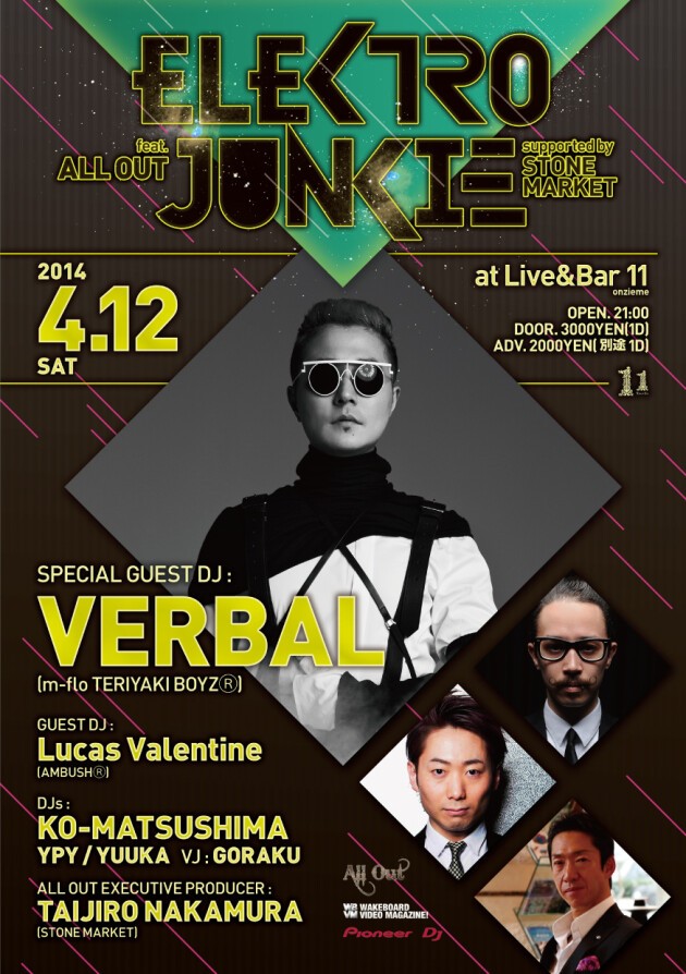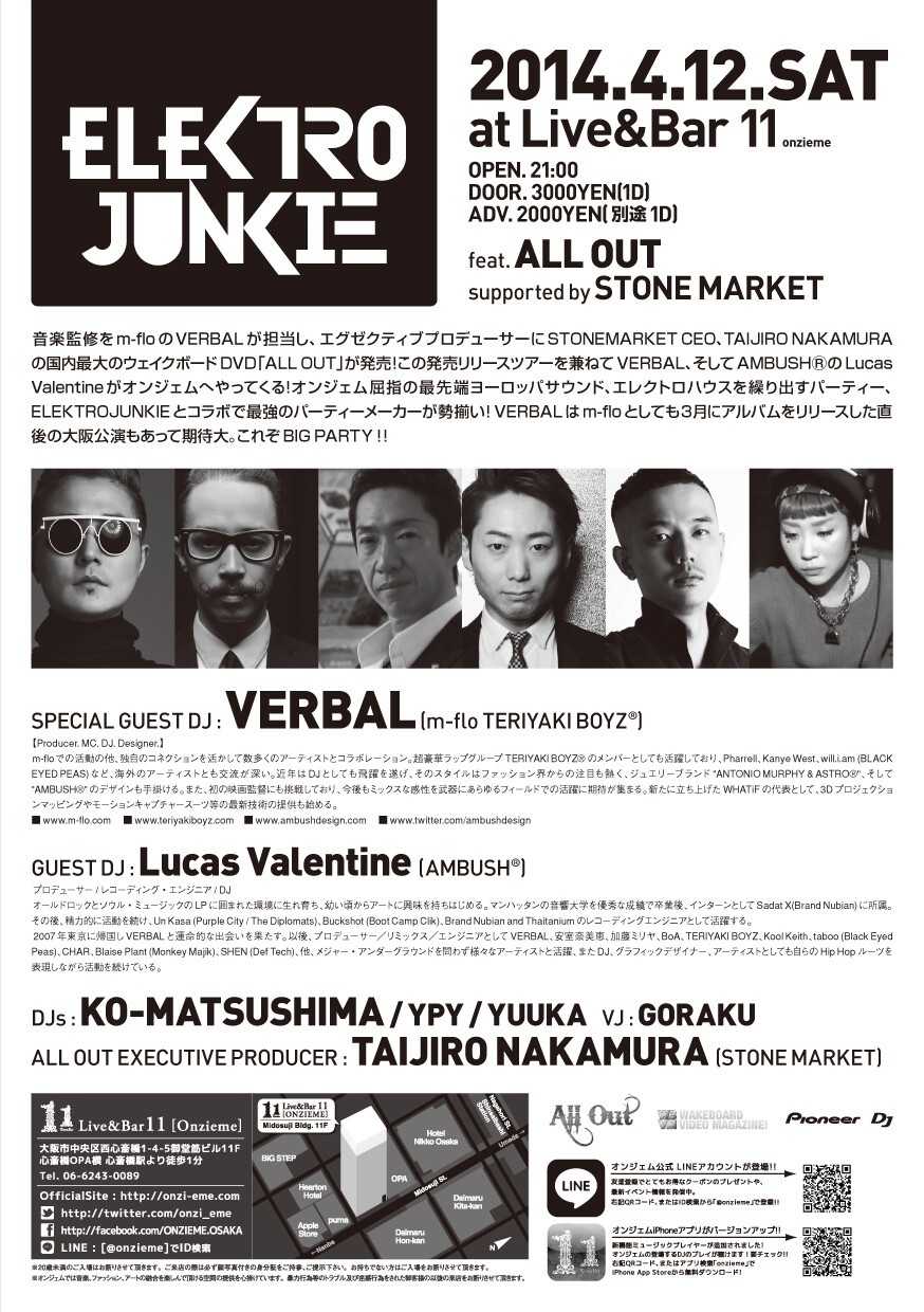 音楽監修をm-floのVERBALが担当し、 エグゼクティブプロデューサーにSTONEMARKET CEO、TAIJIRO NAKAMURAの国内最大のウェイクボードDVD「ALL OUT」が発売!この発売リリースツアーを兼ねてVERBAL、そしてAMBUSHⓇのLucas Valentineがオンジェムへやってくる!オンジェム屈指の最先端ヨーロッパサウンド、エレクトロハウスを繰り出すパーティー、ELEKTROJUNKIEとコラボで最強のパーティーメーカーが勢揃い!VERBALはm-floとしても3月にアルバムをリリースした直後の大阪公演もあって期待大。これぞBIG PARTY!!