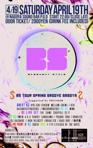 今年1月に開催された2nd Anniversary Tour を見事成功に納め、よりパワーアップしたBSが名古屋P.O.d(4/19)/大阪TRIANGLE(4/24)の2GIGを決行!!大阪初の4BEAT MUSIC vs. BASS MUSIC PARTY を是非ご堪能くださいませ。SHUFFLE DANCE/DNB STEPのダンスカルチャーパーティでもあり、大阪を刺激するDANCE PARTYとなる。今回はNAGOYAからSOUNDER CREWと共にNAGOYAの夜を盛り上げる事マチガイナシ!