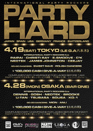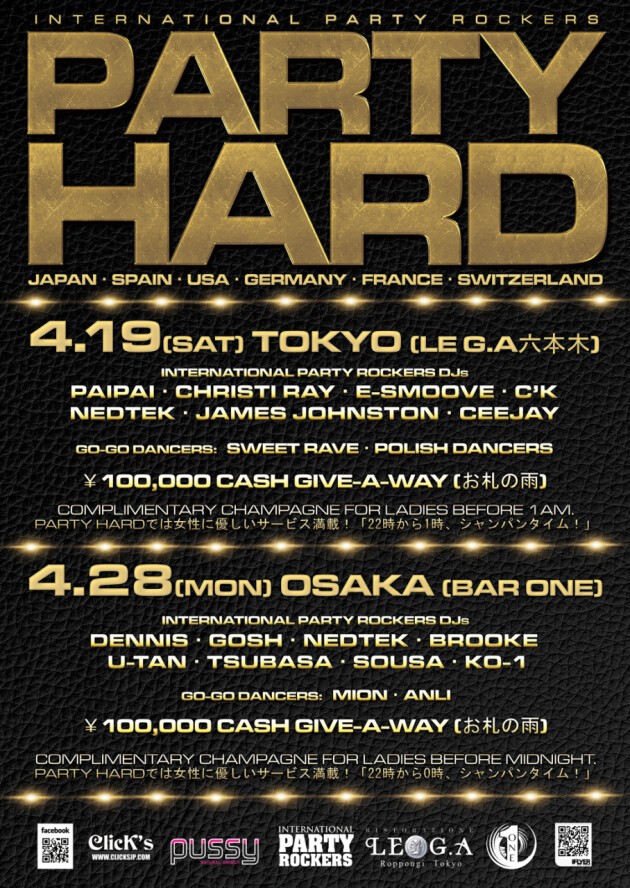 The first Party Hard event took place on May 2, 2012 and since then International Party Rockers’ events have taken place in Tokyo, other cities in Japan and as far away as France, Hollywood, Switzerland, Spain & Germany. In addition, we have released over 17 Mix CDs.