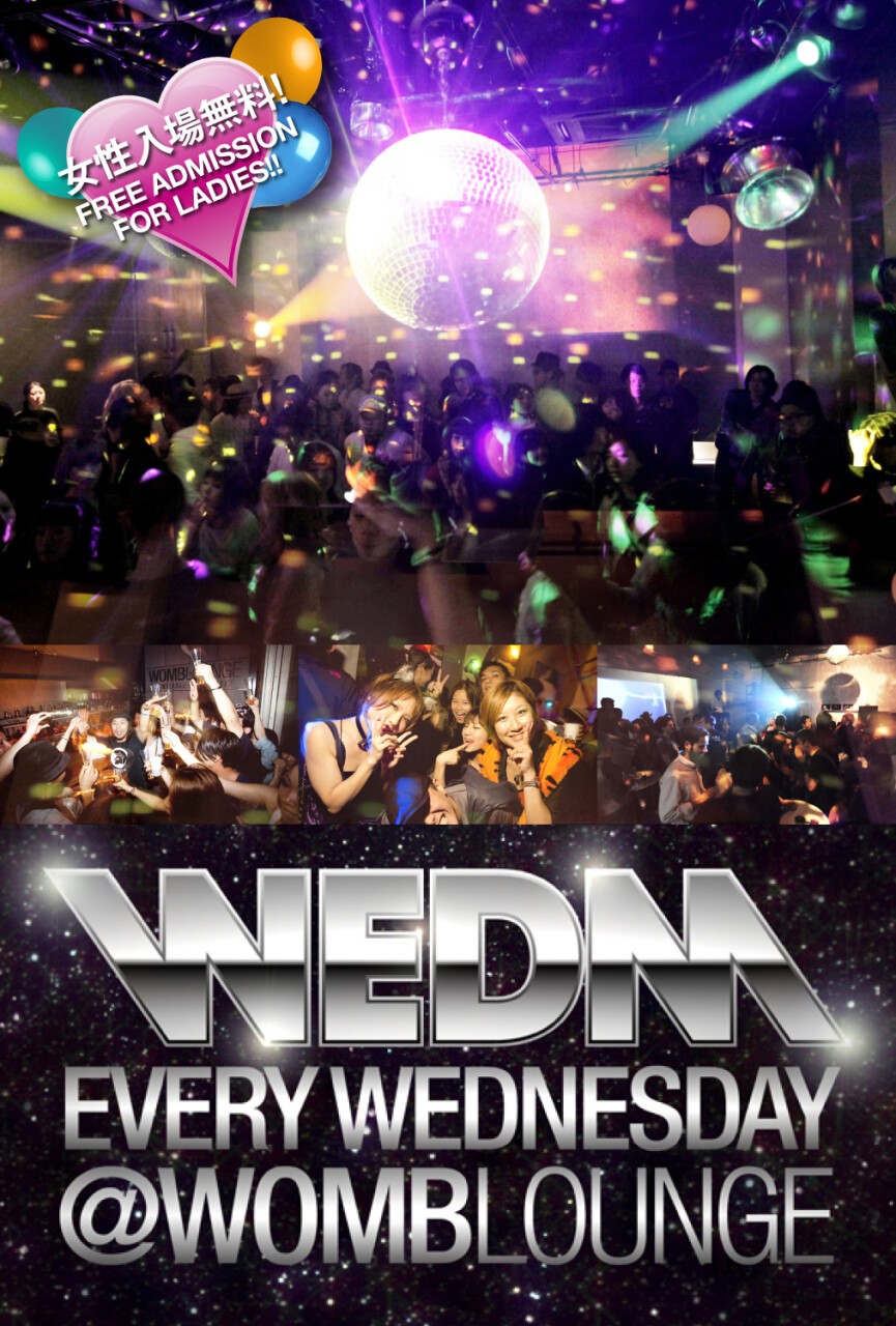 WOMB LOUNGE の"WEDNESDAY EDM"パーティー、その名も WEDM!!! LMFAO や Hardwell、David Guetta 、 Avicii、Afrojack、 Calvin Harris 等が世界的に大旋風を巻き起こし今、世界中の音楽シーンを席巻している音楽ジャンル「EDM」にスポットをあて、最新の EDM はもちろん誰でも知ってるビルボード TOP40 をプレイ♪ 今最も勢いのある音楽とおいしいお酒で平日の夜からみんなで一緒に盛り上がろう。女性の方はエントランスフリー!!!