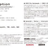 2013年4月、これからのシーンを牽引していくであろう平成生まれの若手により始動した INCEPTION が今回 1ST ANNIVERSARY を迎える。SPECIAL GUEST として、WC RECORDINGS を初めとした数々の国内外レーベルで活躍している GONNO、そしてキャリアは既に20年を超え FORCE OF NATURE のプロデューサーの1人としても知られる KENT の両氏を招聘。ワールドワイドに活躍するアーティストを招聘し、TECHNO, HOUSE, MINIMAL, DISCO と背景の異なる4人の RESIDENT が、型にとらわれない自由な発想で形作る本物の空間に「INCEPTION = 始まり」を是非感じてほしい。