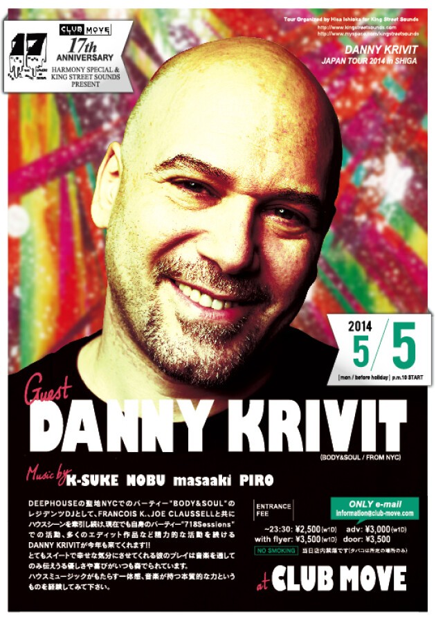 ダニー・クリヴィット。彼はこれまでも頻繁に来日してきたが、日本に到着して最初にすることはいつも同じ。渋谷のレコード・ショップに足を運び試聴を繰り返し、折り畳んだ自作のwant listをポケットからときどき取り出しては、「なあ、これの在庫がないか確認してもらえないか?」…DJとしてのキャリアをスタートして約40年が経過した今も、彼は音楽との新しい出会いに胸を躍らせ、その探究心に妥協はない。1979年にRoxyのオープニングそしてメインDJを4年間務め、その後 Studio 54、The Choice、The Loft、Shelter、Sound Factory Barといったその時代を象徴するクラブで活躍してきたが、96年から始まったパーティによってその名はNYを飛び越え世界中に広まった。それまでMr.K名義で秀逸なリエディット作品を残してきた業績もそれに伴い正当に評価されるようになり、数々のコンピレー ションCDを発売。新旧こだわらず、自分が惚れこんだ楽曲の魅力を(時にはエディットを施し)最大限に活かしてフロアに届けることを信条とする彼のスタイ ルは、パラダイス・ガラージやロフトといった70年代から受け継がれてきた精神でもあり、現在、集客的そしてフロアとの音楽的共有においても最も成功して いるNYのレギュラー・パーティと言えば、彼がレジデントを務めるに他ならない。これまでのダニーの滋賀でのプレイはダンス・クラシックス中心だが、彼はラリー・レヴァン始めこれまでの先達が生み出したヒット曲に甘んじず、常に自身のクラシックスを追い求めている。何十年も前の曲が流動的にセットに組み込まれるその現場に古臭さはなく、時代のスタイルに反映し、革新的だ。ダニー・ クリヴィットはDJというアートフォームの一つの完成形であり、円熟期を迎えた今だからこそ、改めて彼のプレイをじっくりと堪能してもらいたい。