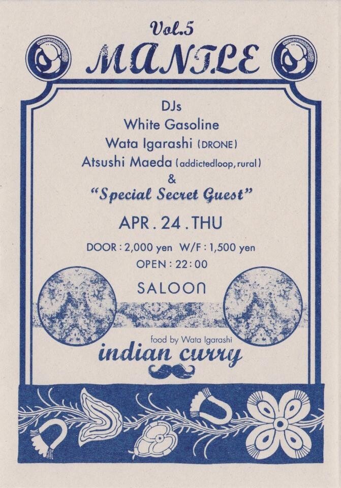 SALOONにて10月よりスタートし、不定期ながら毎回濃いゲストを招き話題のMANTLEにスペシャルゲストDJとして先日のLOUVERでの公演も大好評だったPrologueのDino Sabatiniの出演が決定!!!平日から贅沢な空間となる事は間違いないので乞うご期待!更に毎回出演者が作り大好評のFOOD、今回はWATA IGARASHIによる特製カレー!少数のため売り切れ必至なので早い時間からの来場を。