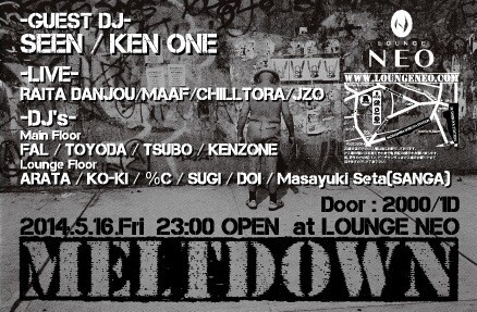 GUESTに、DJ SEEN 、DJ KEN ONEを迎え、MC LIVEに熟練のRAP STYLEを披露してくれるRAITA DANJOU、ONENESS.proからも日本語を巧みに操るMC陣、そして渋いBEATをかけてくれるDJ陣。6F LOUNGE FLOORにもセンスのいいDJ達が豊かな空間を仕上げてくれます。