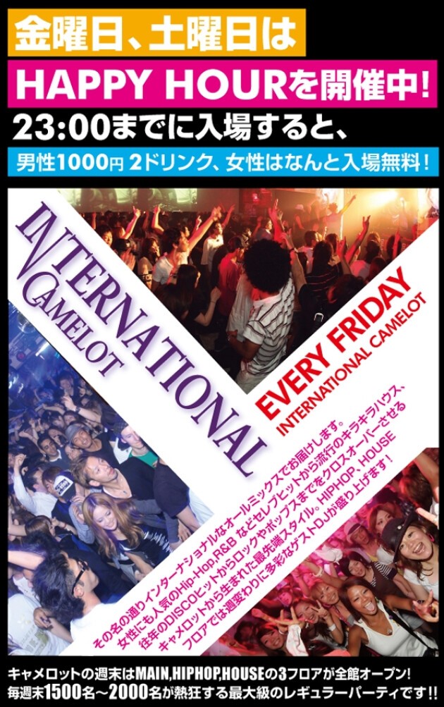 HAPPY HOUR 21:00~23:00(MEN¥1000/2d WOMEN ENTRANCE FREE)