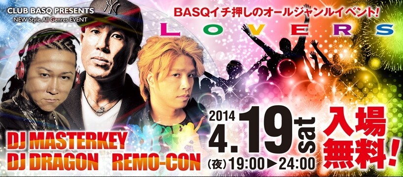 CLUB BASQ,いち押しプッシュ、プッシュ!!のイベント『LOVERS』!! 県内外の最強DJ陣が、エッジの効いた選曲で土曜の夜をロック!! また、世界、そして日本国内で活躍中のDJ MASTERKEY/DJ DRAGON/DJ Remo-con」がそれぞれ、MASH UPしたトラックを使いフロアを最高調に誘います。スペシャルイベント『LOVERS』!! なんと入場は、無料!! 是非お待ちしております。