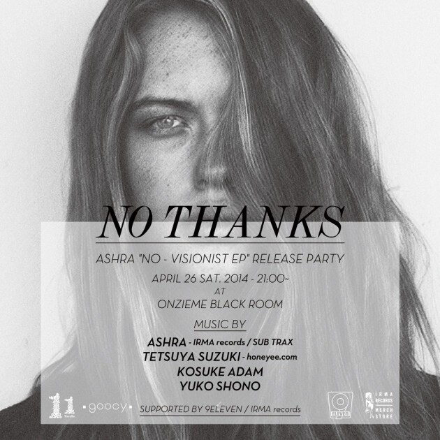 NO THANKS ASHRA "NO / Visionist EP" RELEASE PARTY 2014/4/26(SAT)21:00~ at ONZIEME BLACK ROOM act: ASHRA (IRMA records/ SUB TRAX) TETSUYA SUZUKI (honeyee.com) KOSUKE ADAM YUKO SHONO supported by 9ELEVEN / IRMA records / goocy