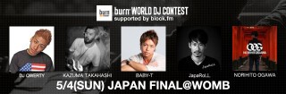 4/4(金)に行われた「burn WORLD DJ CONTEST 2014 セミファイナル」@渋谷clubasiaにて遂に5組のファイナリストが決定し、4/12(土)、13(日)のJAPAN BOOT CAMPにて小室哲哉、KEN ISHII、☆Taku Takahashiらメンターから講習や課題を受けた彼らがいよいよ、5月4日(日)の決勝戦に出場する。
