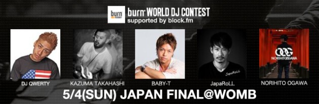 2014年5月4日(日)に東京・WOMBでエナジードリンク「burn」の主催によりスペイン・イビサ島で開催されるDJの世界大会「burn RESIDENCY」の日本代表を決めるコンテスト「burn WORLD DJ CONTEST 2014 JAPAN FINAL」が行われる。