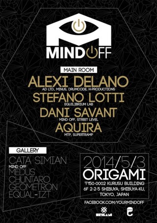 今回、新しいプロジェクトとしてスタートする"Mind Off"は独自の解釈でスウェーデンやニューヨークのエッセンスを散りばめたテクノミュージシャン"Alexi Delano"を招き、GWスペシャルとしてORIGAMIで開催!