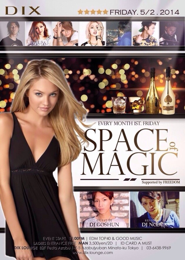 現在、20代前半から絶大な支持を持つDJ NOBUK! をORGANIZEに置き、様々な分野で特化している若者が集い遂にNEW PARTY 【SPACE of MAGIC】が麻布DIXに上陸!女性向けのclubをコンセプトに純粋に音楽を楽しめる空間を提供!普段他のclubでは味わえないお洒落な空間を生み出すNEW PARTY !スペマジの威力に今後、目が離せない!!