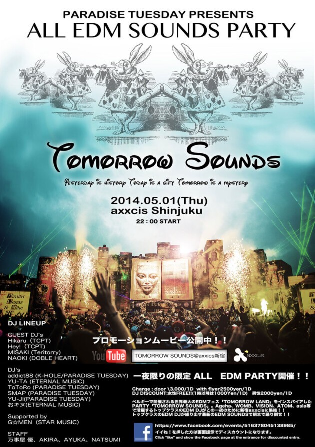 「TOMORROW SOUNDS」。Ageha、WOMB、VISION、ATOM、asia等で活躍するトップクラスのEDM DJが