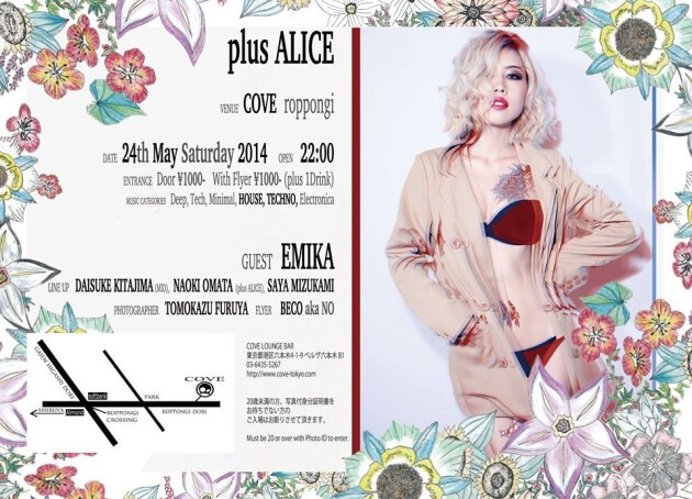 パーティーへの新たなアプローチとしてデコレーションされた空間に包まれながら “女性” をフィーチャーする "plus ALICE” の初回ゲストは国内外問わずにゲストオファーが急増中のEMIKAを招聘。モデルとして活躍し、シンガーとしての実力を持つEMIKAがアクティヴな活動の中で培った独自のアンダーグラウンドミュージックで魅了されることは難しくない。