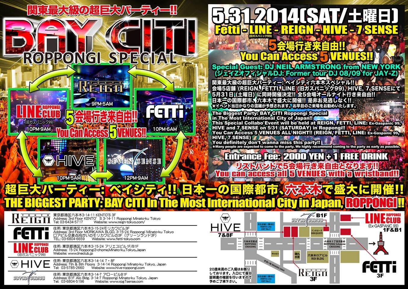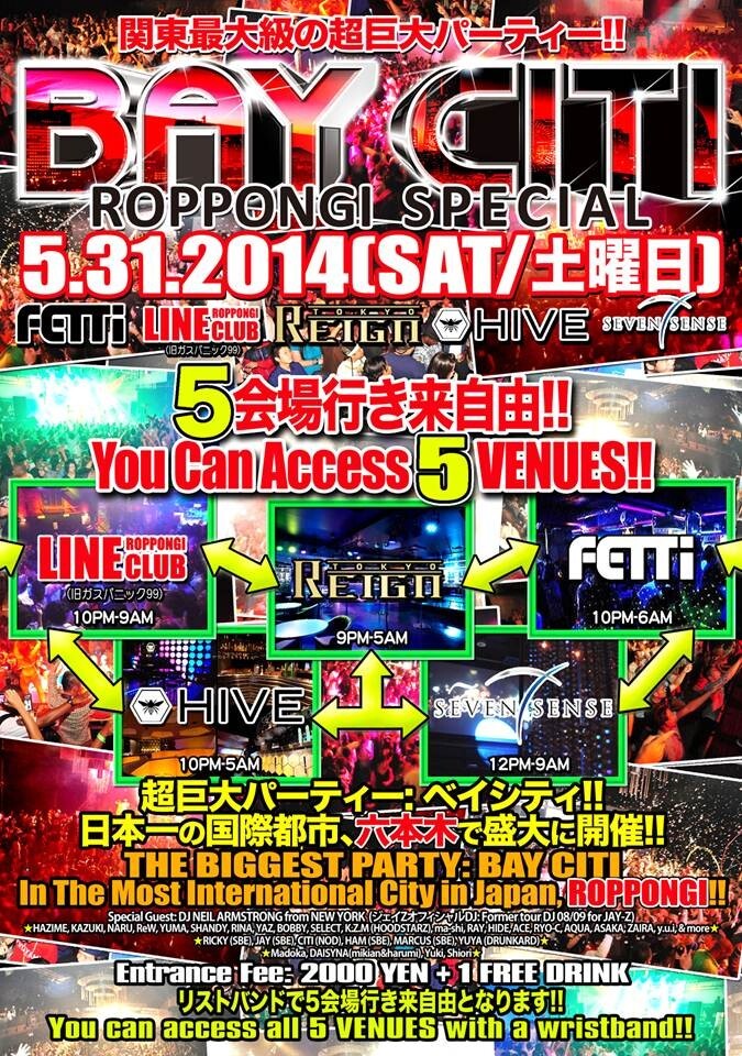 (5/31 土曜日: SATURDAY) BAY CITI ROPPONGI SPECIAL 5会場オールナイト行き来自由☆You Can Access 5 VENUES ALL NIGHT: Fetti-REIGN-LINE (Ex GASPANIC 99)-HIVE-7 SENSE