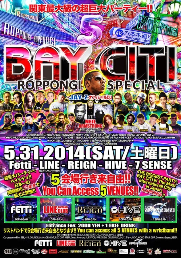 関東最大級の超巨大パーティー: ベイシティ六本木スペシャル!! 会場5店舗 (REIGN, FETTI, LINE (旧ガスパニック99), HIVE, 7 SENSEにて5月31日 (土曜日) に同時開催決定!! 全5会場オールナイト行き来自由!!