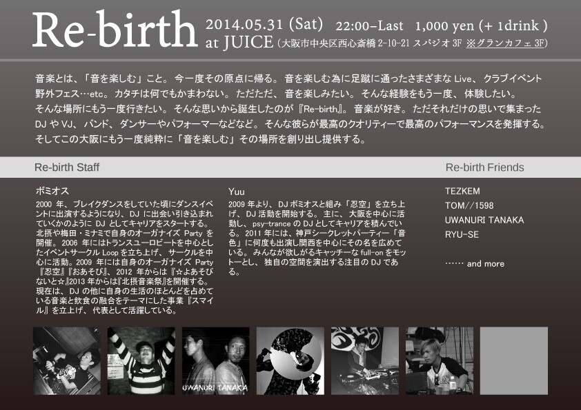 2009年には自身のオーガナイズParty『忍空』『おあそび』、2012年からは『☆よあそびないと☆』2013年からは『北摂音楽祭』を開催する。