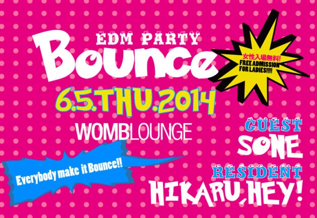 WOMB LOUNGE のニューパーティー「Bounce」!!! 跳ねるという意味を持つ Bounce は今や EDM の定番用語です。Hardwell、Alesso、Avicii、Afrojack、TJR 等が世界的に大旋風を巻き起こしている「EDM」にスポットをあてた激モリパーティー! 今最も勢いのある音楽とおいしいお酒で平日の夜からみんなで一緒に盛り上がろう!!! 女性の方はエントランスフリー!!! 入場無料です!