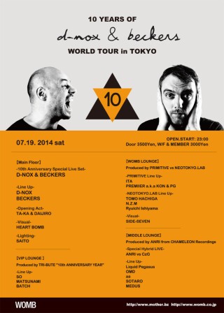D-NOX&BECKERS結成10周年の節目となる本年、「10th Anniversary World Tour」と銘打ち、全世界40都市をサーキットする大規模なツアーを展開。ここ日本では大盛況を博した2008年のWOMB初公演以降二度目の開催が決定した! D-NOX&BECKERSの10周年スペシャルとなるプレミアライブのほか、D-NOX、BECKERSの単独DJに加え、オープニングアクトとしてTA-KA&DAIJIROも出演。またD-NOX&BECKERSと古くから親交があり、今年を10周年YEARと銘打つTRI-BUTEをはじめ、PRIMITIVE vs NEOTOKYO.LAB、CHAMELEON RECのANRIなど、音楽性の高さと幅広さを重視したMotherらしい編成で各フロアを彩る。