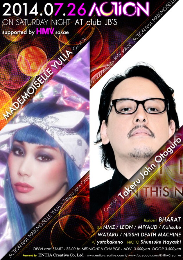 2014年夏に、NEWパーティ『ACTiON』が始動。会場は"club JB'S"。初回のゲスト出演者には、ジャンルに囚われないオリジナルな選曲やパフォーマンス、ファッションセンスによりDJ、シンガー、デザイナー、ファッション・アイコン、コラム執筆等多岐に渡り活躍をみせる「MADEMOISELLE YULIA / マドモアゼル・ユリア」と数々のトップDJたちのパーティへの出演、日本唯一のダンス音楽専門ラジオ"block.fm"のプライムディレクター・ナビゲーターでもある「Takeru John Otoguro」が登場。レジデントには"ENTIA RECORDS"所属「BHARAT」、そして「NMZ」「LEON」「MIYAUD」「Kohsuke」「WATARU」「NISSHI DEATH MACHINE」といった名古屋屈指の出演陣が揃う。新たにそのカタチを現した"ENTIA"のNEWパーティ『ACTiON』が、貴方のココロの深くに喜楽の記憶を刻む一夜をお贈りします。