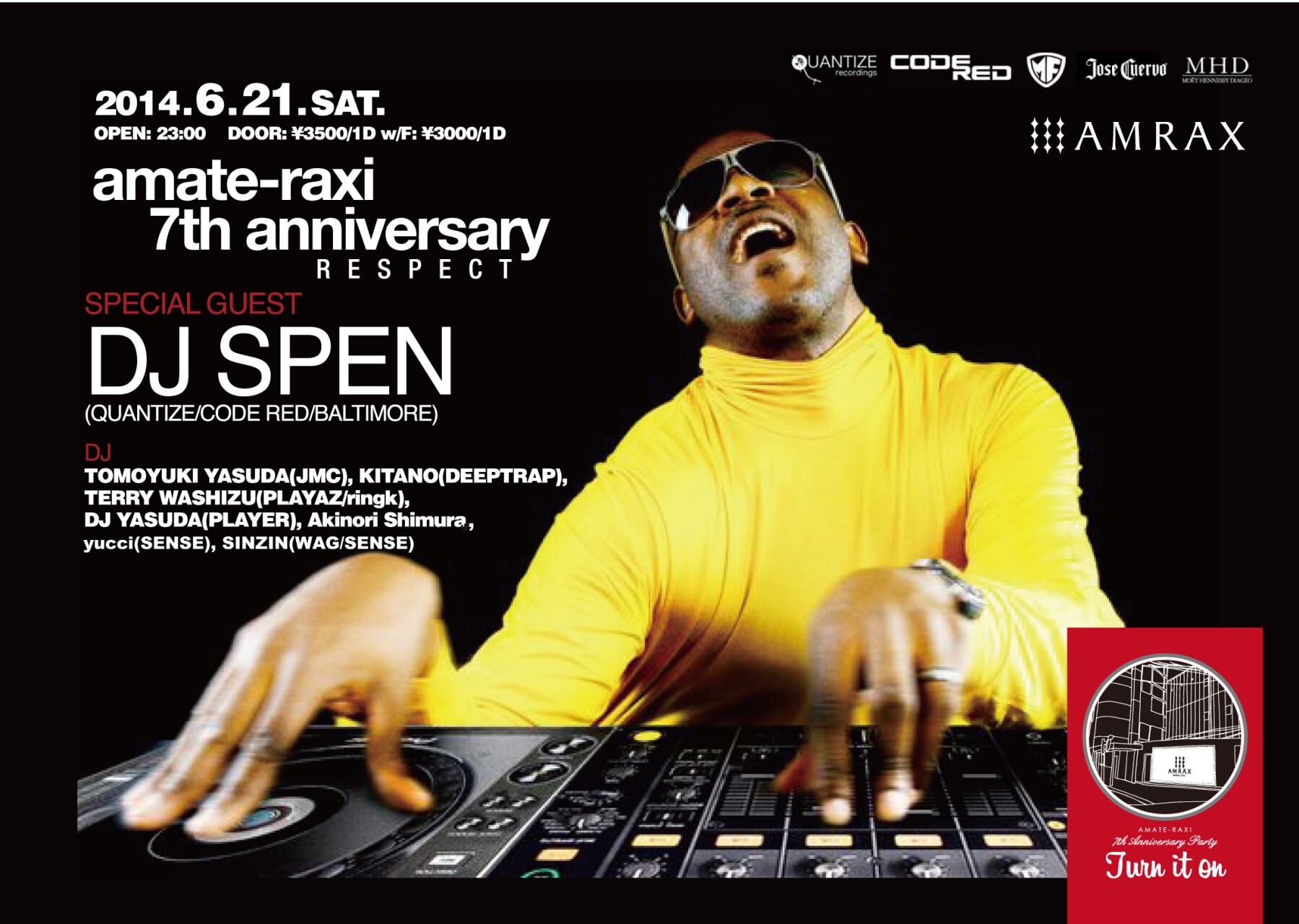 DJ: TOMOYUKI YASUDA(JMC), KITANO(DEEPTRAP), TERRY WASHIZU(PLAYAZ/ringk), DJ YASUDA(PLAYER), Akinori Shimura, yucci(SENSE), SINZIN(WAG/SENSE), DJ KIWA