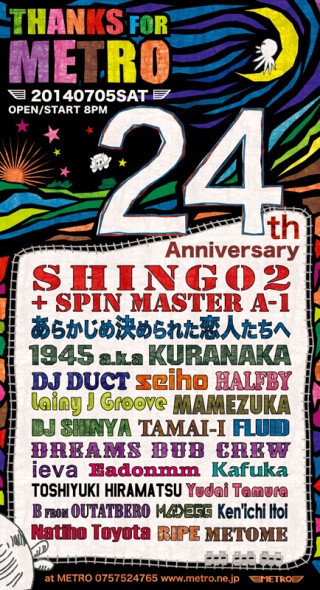 心よりお礼を申し上げます。今宵はメトロ24周年アニバーサリーとして、メトロの現在 / 過去 / 未来をつなぐスペシャルな祭りを開催します!Shing02 + SPIN MASTER A-1、あらかじめ決められた恋人たちへ、KURANAKA、DJ DUCT、seiho、HALFBY、MAMEZUKA、Lainy J Groove等々のビッグゲストからメトロをメトロたらしめてくれるゆかりのアーティストの皆様、今後の音楽シーンの未来を切り開く新しいアーティストの皆様に出演して頂き、更にはセカンドフロアまで拡大して、全方向性のパーティーを盛大に行ないます!