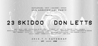 都内最高峰のクオリティを誇るシステムと代官山という都心に位置しながらも純粋なミュージック・ラヴァーズが集う場所として、オーディエンスは元よりこれまで出演した多くアーティストから高い評価と信頼を得てきた代官山UNITも、今年でオープンから10周年。節目となる本年度のアニバーサリー・パーティーも、毎年オーディエンスの度肝を抜く数多くの伝説的なアーティストを招聘してきたこれまでのアニバーサリー同様に"まさか"のアーティストを迎え開催します! 今回はイギリス、シェフィールドで結成され同郷のCabaret VoltaireやThrobbing Gristleなどと交流をもちながら、独自のエスノ・インダストリアル・ファンクを展開した23 Skidooが何と奇跡の初来日! 更に映画監督、ミュージシャン、DJとしての顔を持ち、パンク・ロックとレゲエを融合させたキーパーソン、Don Lettsの出演が決定と、正に節目のアニバーサリーに相応しいゲストが決定しました。そして今年ももちろんUNIT/SALOON/UNICEの3フロアを全面開放しての開催。馴染み深い国内出演者を多数迎え賑々しくアニバーサリーを祝います!!日頃会場に足を運んでくれている多くの人達に感謝を込めて、今年も最高のパーティーを演出する事をお約束します!