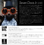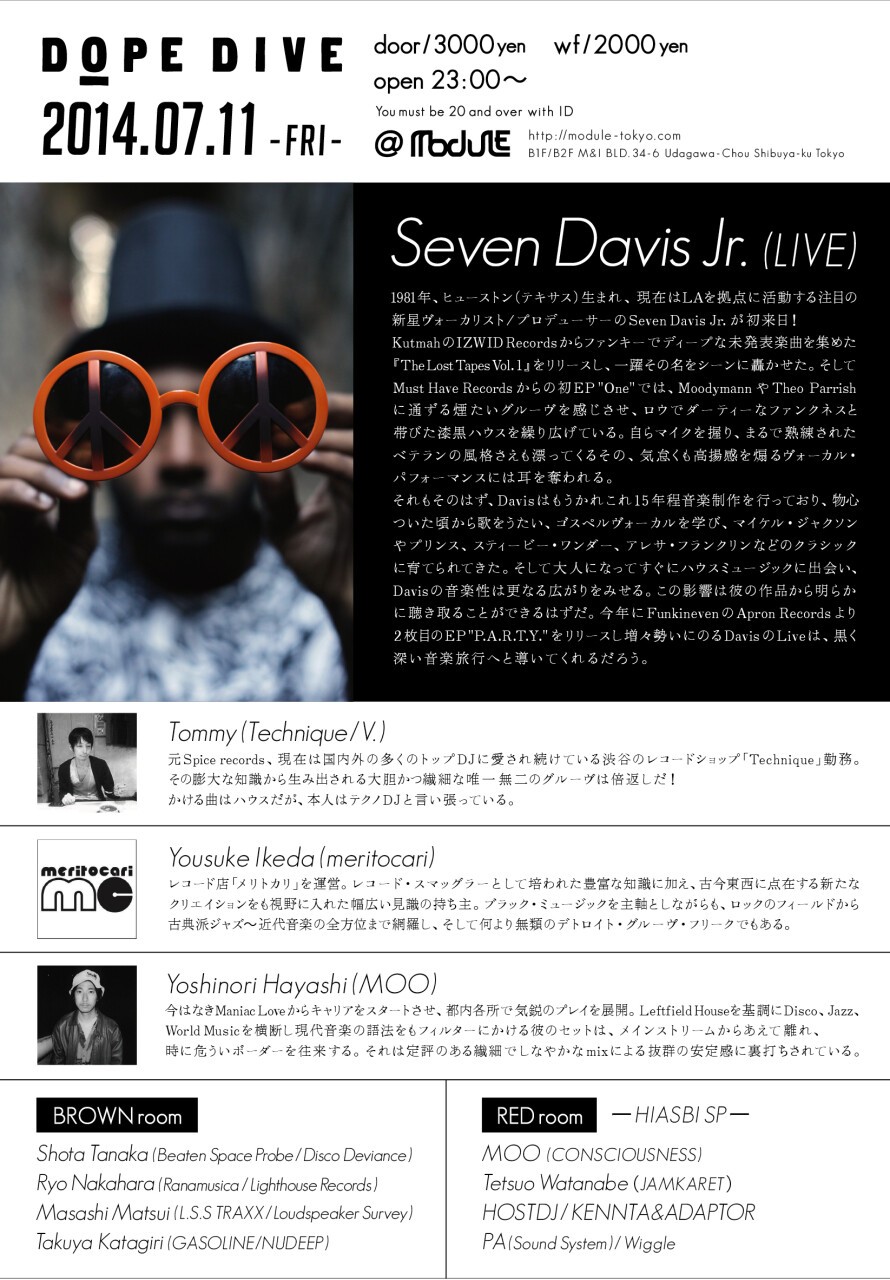 1981年、ヒューストン(テキサス)生まれ、現在はLAを拠点に活動する注目の新星ヴォーカリスト/プロデューサーのSeven Davis Jr.が初来日!KutmahのIZWID Recordsからファンキーでディープな未発表楽曲を集めた『The Lost Tapes Vol. 1』をリリースし、一躍その名をシーンに轟かせた。そしてMust Have Recordsからの初EP "One" では、MoodymannやTheo Parrishに通ずる煙たいグルーヴを感じさせ、ロウでダーティーなファンクネスと帯びた漆黒ハウスを繰り広げている。自らマイクを握り、まるで熟練されたベテランの風格さえも漂ってくるその、気怠くも高揚感を煽るヴォーカル・パフォーマンスには耳を奪われる。それもそのはず、Davisはもうかれこれ15年程音楽制作を行っており、物心ついた頃から歌をうたい、ゴスペルヴォーカルを学び、マイケル・ジャクソンやプリンス、スティービー・ワンダー、アレサ・フランクリンなどのクラシックに育てられてきた。そして大人になってすぐにハウスミュージックに出会い、Davisの音楽性は更なる広がりをみせる。この影響は彼の作品から明らかに聴き取ることができるはずだ。今年にFunkinevenのApron Recordsより2枚目のEP "P.A.R.T.Y."をリリースし増々勢いにのるDavisのLiveは、黒く深い音楽旅行へと導いてくれるだろう。