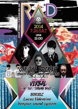 大沢伸一と上村真俊によるDJユニット、OFF THE ROCKER。そしてm-floの最新アルバム「FUTURE IS WOW」をリリースしたばかりの21世紀型マルチ・アーティスト、VERBAL。この両者によるイベント『RAD』が、早くも次なる開催を迎える。真夏のミュージックラフの開幕を告げる今回は、これまで同様、OFF THE ROCKERとVERBALが立つDJブースの周囲を来場者に開放。出演者とクラウドが一緒になり、パーティを組み立てていく。さらに、前回に続き、80KIDZがゲスト出演することも決定!音楽性のみならず、パーティの価値をさらにレベルアップさせた『RAD』。そのエキサイティングでカオスなエネルギーが威力を増す!!!