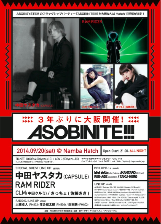 出演者にはレジデントである中田ヤスタカ(CAPSULE)はじめ、RAM RIDER、CLM(中田クルミ)、さっちょ(佐藤さき)など新木場ageHaでのASOBINITE!!!ではおなじみのメンバーと、大阪からはFM802の大抜卓人や落合健太郎、西田新らが。さらにidiot deUx(idiot j’adore)、KANTARO、REE-AGE(GLISTER)、TAKU-HEROらの大阪のクラブシーンを盛り上げるDJ陣も一挙集結。