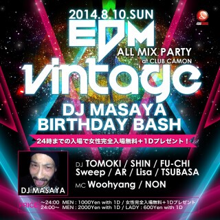 【毎週日曜VINTAGE】8/10(日)☆DJ MASAYA BIRTHDAY BASH!!!!日曜カモンは関西主要CLUBで活躍中のGLISTERメンバーがお届けする終日女性入場無料のEDM & ALL MIX PARTY『VINTAGE』☆☆