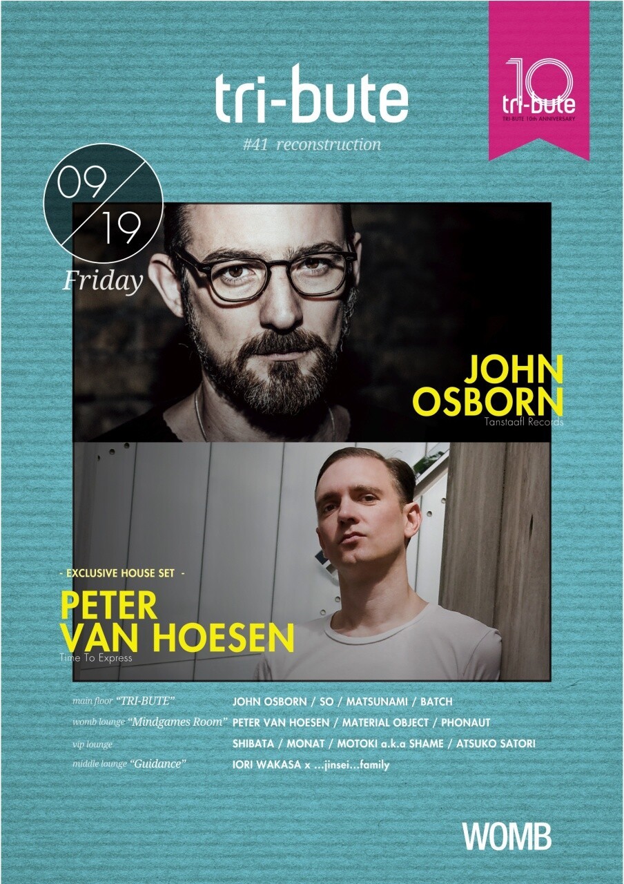 2004年に SO、MASTUNAMI、BATCH の3人でスタートし、様々なロケーションで、次々とユニークな企画を打ち出して来た TRI-BUTE。アンダーグラウンドシーンにおいて着実に活動を積み重ねて、これまで WILL SAUL、PABLO BOLIVAR、DAVE DK、YOUANDEWAN、CHYMERA 等フレッシュで次世代を担うであろう海外アーティスト達をいち早く日本に紹介し、シーンに新しい風を吹き込んできた。2014年はその活動の記念すべき10周年を迎え、10周年 YEAR と題し年間を通じてスペシャル企画をドロップ中。6月13日に FRED P を招聘して UNIT にて開催された #40 に続き、第2回目となるこの #41 では JOHN OSBORN をフィーチャー。ロンドンにてキャリアをスタートし、現在ベルリンを拠点に活動中。TECHNO~HOUSE を途切れないグルーブと共に高い次元でミックスするアーティストとして高い評価を得て、今年は苗場グリーンランドで開催される国内屈指の野外フェス THELABYRINTH 2014 にも出演予定。その翌週での登場となる。TRI-BUTE としては2011年の震災直後に大きな話題となったチャリティ企画を含む #35 以来、実に3年ぶりとなる WOMB 開催に大きな期待が高まる。