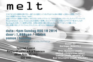 そして、2011年7月より、超絶テクノパーティー「melt」を始動し、妥協のない音を展開。2012年よりHouse・Techno系パーティー「SPARKLE」も開始。また同時に写真撮影活動も行い、視覚的な感覚も研ぎ澄ます。宇宙の視点に立って航行する、Dark&Deep&Dopeな3D健康優良不良(少)女☆。