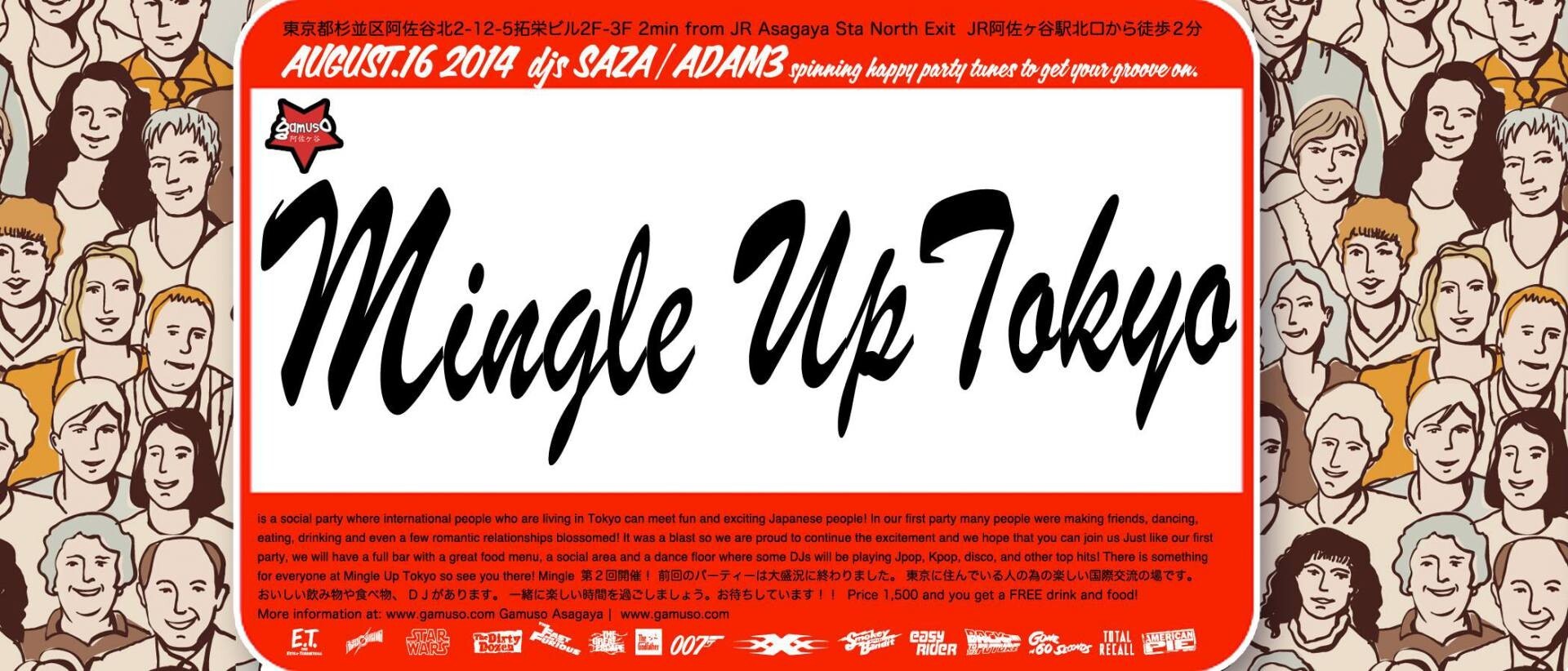 Mingle Up Tokyo is a social party where international people who are living in Tokyo can meet fun and exciting Japanese people! In our first party many people were making friends, dancing, eating, drinking and even a few romantic relationships blossomed! It was a blast so we are proud to continue the excitement and we hope that you can join us Just like our first party, we will have a full bar with a great food menu, a social area and a dance floor where some DJs will be playing Jpop, Kpop, disco, and party tunes! There is something for everyone at Mingle Up Tokyo so see you there! Mingle Up Tokyo 第2回開催! 前回のパーティーは大盛況に終わりました。 東京に住んでいる人の為の楽しい国際交流の場です。 おいしい飲み物や食べ物、DJがあります。 一緒に楽しい時間を過ごしましょう。 お待ちしています!!