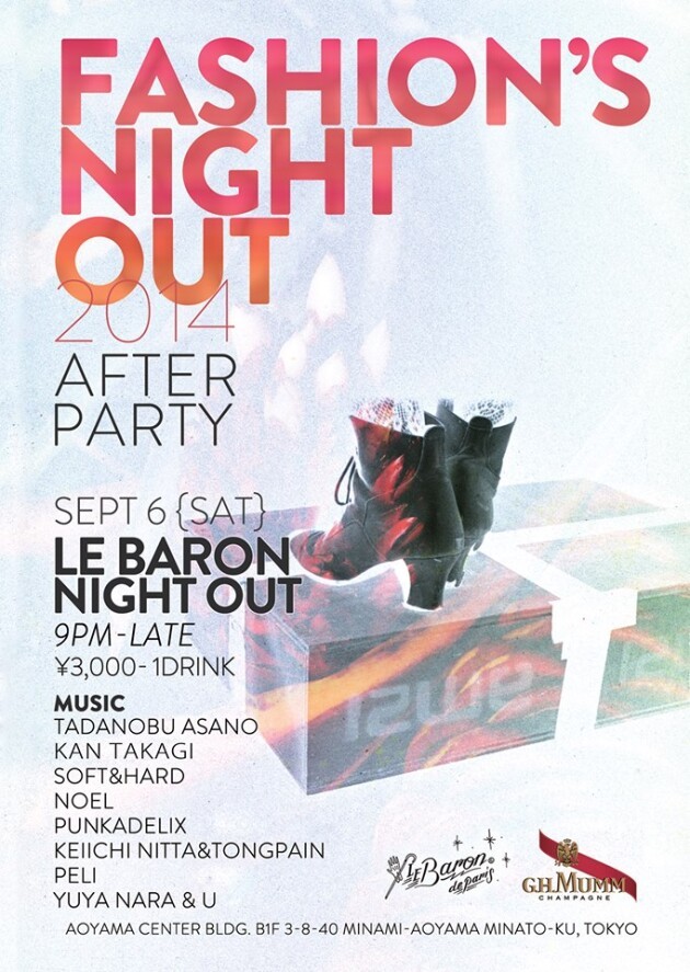 VOGUE主催のFASHION’S NIGHT OUT VOL.6が開催される9月6日。11時まで表参道界隈でパーティーホッピングを終えたファッショニスタが行き着く場所はココ、Le Baron de Paris!アフターパーティーのDJラインナップもファッション界で活躍する顔ぶればかり。ファッションフォワードな夜をお楽しみください!