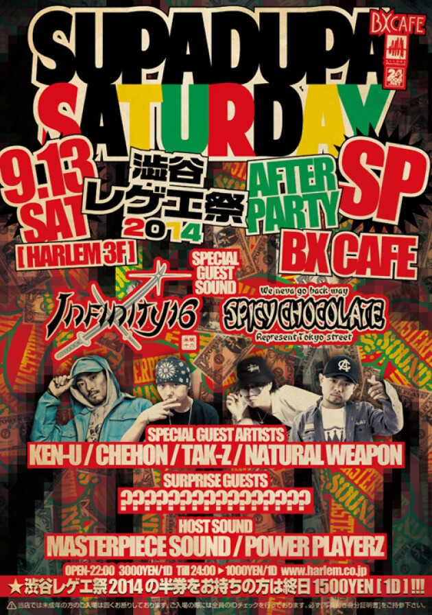9月13日の祝前日は、HARLEMの3階フロアBX CAFEにて“SUPA DUPA SATURDAY SP. 渋谷レゲエ祭2014 AFTER PARTY”を開催!