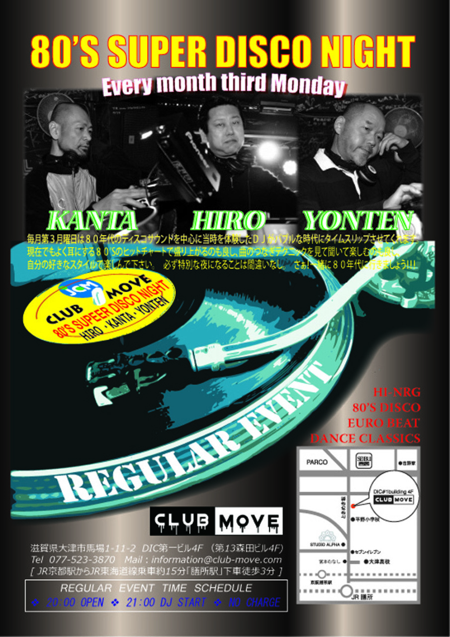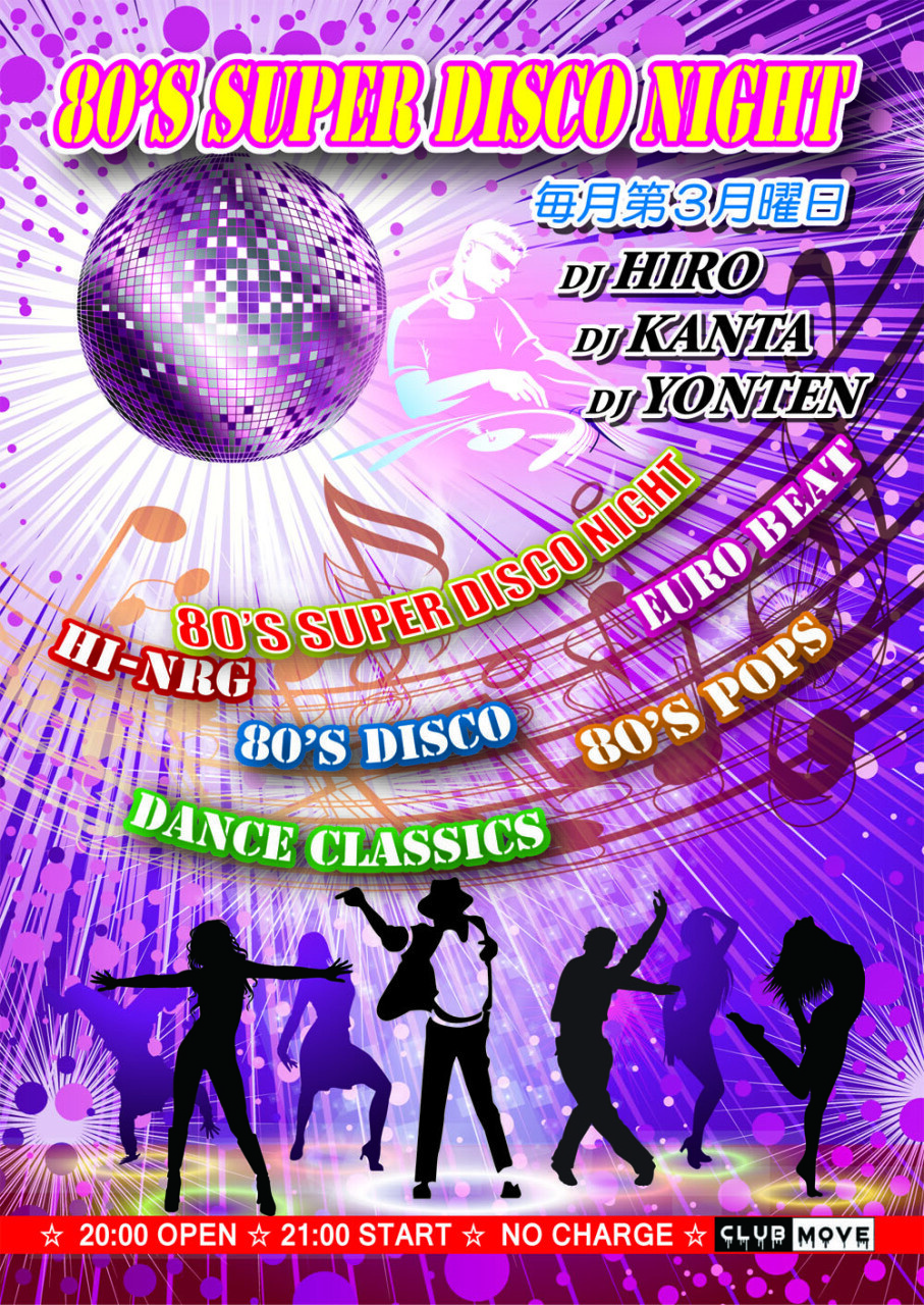 80’S SUPER DISCO NIGHT!毎月第3月曜日は80年代のディスコサウンドを中心に当時を体感していたDJ達がバブルな時代にタイムスリップさせてくれます。