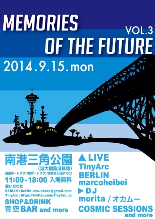 音で世界を旅するジャムバンド「TinyArc」とジャーマン直系人力即興トランス「BERLIN」に加え、浮遊感あふれる空間を生み出すトライバルアンビエント楽団「marcoheibei」、辺境系ごった煮ダブユニット「espathos」をお呼びして、野外ならではの音空間を展開します。