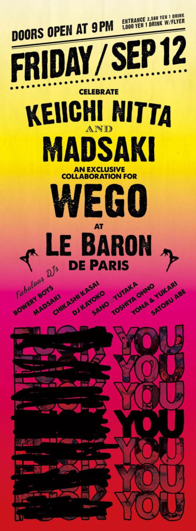 WEGOからフォトグラファーの新田桂一氏とタイポグラファーとしても活躍するMADSAKI氏のコラボレーションファッションアイテムが9月12日金曜日に発売される。今夜はその発売を記念したスパシャルパーティーを開催。Le Baron de Parisでお馴染みの精鋭なるDJ陣が登場。エッジーなWEGO NIGHTをお楽しみ下さい。
