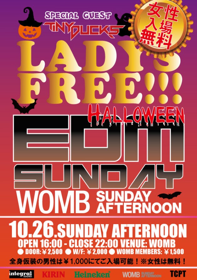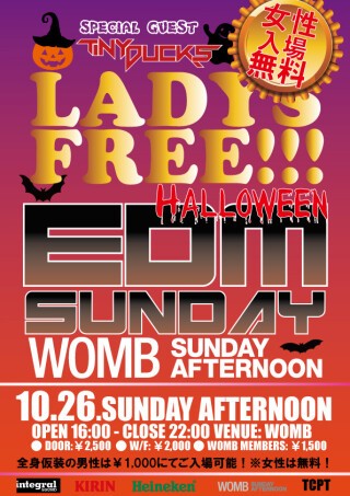 From the newest EDM to hugely popular songs that everybody knows, let's party up on Sunday from 16:00 in the evening to 22:00 at night at Japan's biggest six-hour-long EDM bash, WOMB SUNDAY AFTERNOON! Free admission for ladies!
