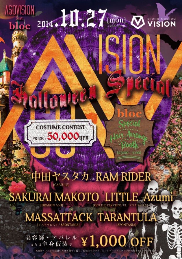 “ASOVISION” Halloween party has been always exciting even though it is on weekdays. This will be their 3rd year of Halloween party at VISION. This party is organized by organizers collective “ASOBISYSTEM” who leads Harajuku culture. They gonna have very special line up featuring YASUTAKA NAKATA and RAM RIDER and more. They will also have costume contest. Winner can get 50,000yen! There will be hair stylist / fashion people discount to invite more fashion & beauty people. So, costume contest will be higher level! Join us to special monday night.