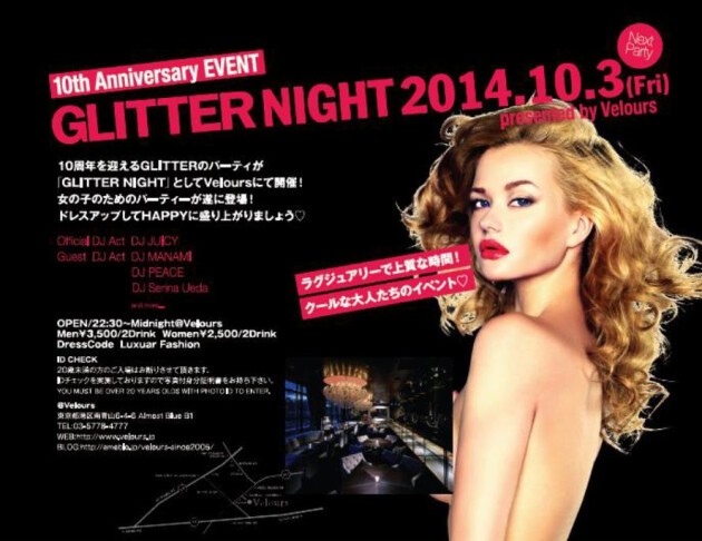 10周年を迎えるGLITTERのパーティーが「GLITTER NIGHT」として登場し、第3段としてVeloursにて開催決定!!