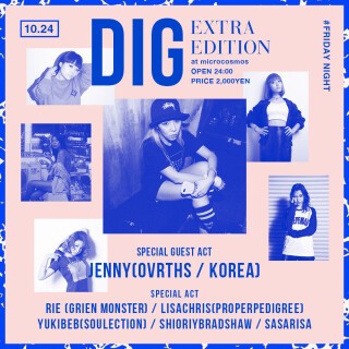 国内外を問わずフレッシュで個性溢れる、これからのミュージック&カルチャーシーンを担うアーティストが多数集結し開催されるNEW PARTY 「DIG」。6月に渋谷WOMBで開催されたKICK OFF PARTYでは、韓国ソウルのクルー「DEADEND」からKINGMCK,SMOODを迎え、フロアを熱狂させた今回はDIG ~ Extra edition ~としてDEADENDと肩を並べるソウルのクルー「OVRTHS」からの紅一点JENNYを招聘。日本からはRIE,LISACHRIS,YUKIBEB,ShioriyBradshaw,SASARISAと今の東京を代表するフィメールDJが出演!見逃せないアーティストが一堂に介す注目の夜、時代の変化を体現せよ。