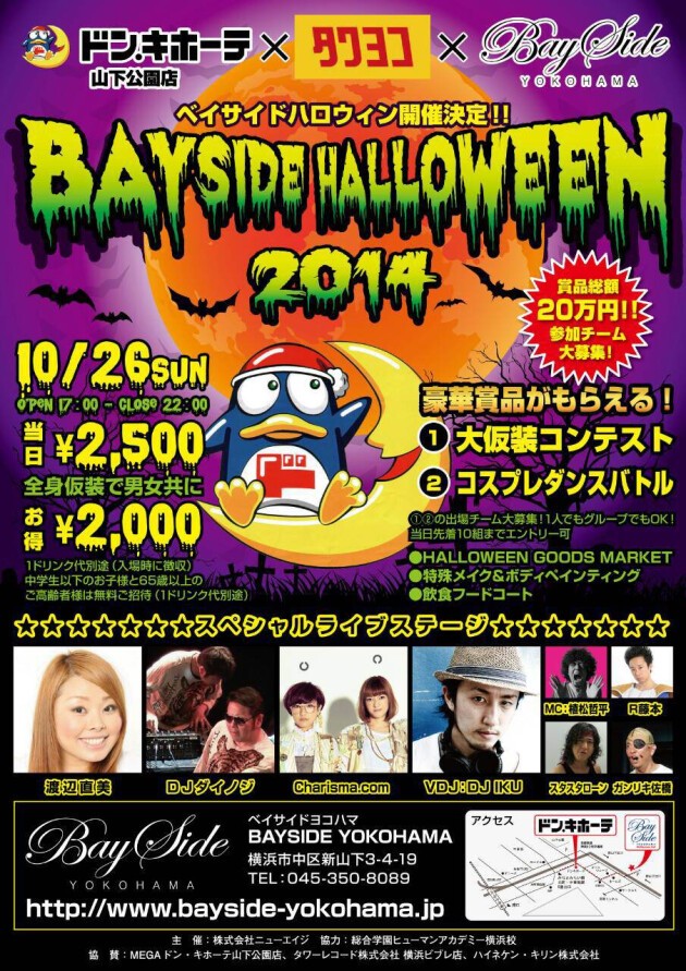 10月26日(日)ベイサイドヨコハマとMEGAドン・キホーテ山下公園店とタワーレコード横浜ビブレ店の強力コラボによる地域活性を目的とした古今東西ジャンル不問の大仮装パーティ「BAYSIDE HALLOWEEN 2014」を開催!目前に拡がる横浜港を眺めながら最高のロケーションでハロウィンを満喫![music] [beauty] [entertainment] [gourmet]と様々なコンテンツがミックスした、コドモからオトナまで楽しめる、まったく新しいタイプのハロウィンパーティをお届けいたします!