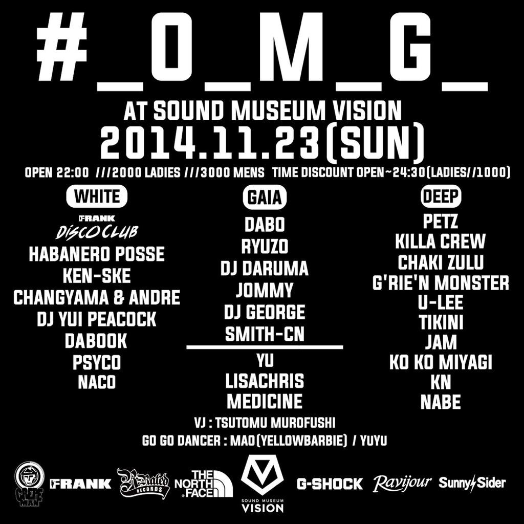 先端であり異端であるということ。DJ DARUMAとRYUZOの呼びかけにより集められた五人のクリエイター(DJ DARUMA、DJ JOMMY、DJ GEORGE、RYUZO、DABO)が作り出すパーティーはあらゆるボーダーを越えようとするストリートのアミューズメントパークである。時間という縦軸とジャンルという横軸の上を縦横無尽に飛び回るタフなビート。思い思いのファッションに身を包んだパーティークラウド。それはまさに五人を繋げたヒップホップというモンスターミュージックを現代風に体現した空間であり、あらゆるダンスミュージックとストリートファッションが交差する「アンテナ立ってらっしゃる方々」のサロンとして今や全国にも名を轟かせている。そのOMGが満を持して東京にカムバック!噂の真相をあなたの目と耳が確かめる夜はもう近い。