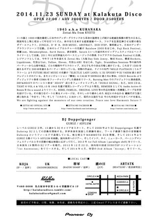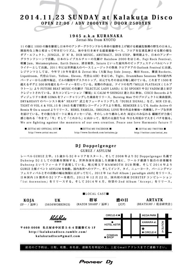 前売りのご予約は、タイトルを「11/23 DUBBINチケット予約」とし、本文に枚数、お名前、連絡先を明記の上 Kalakutadisco アットマーク gmail.comまでご連絡ください。