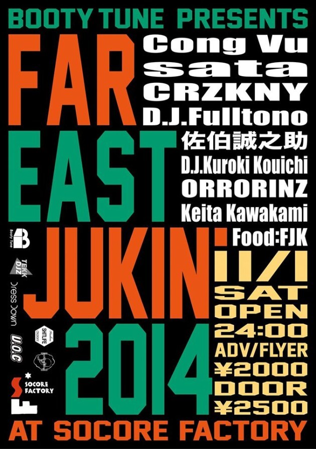 日本から世界へ、ジューク/フットワークサウンドを発信し続けるレーベルBooty Tune主催。日本と韓国が極東ジューク同盟を結び開催される “Far East Jukin” 初回の開催都市は大阪。韓国でのジューク/フットワーク先駆者であるCONG VUは、今年8月にTRAXMANのソウル公演にも出演。相棒のsataと共にシーンを引っ張る存在である。迎え撃つは、日本各地で名を馳せるお馴染みの面々。ジューク入門編でもあるこのパーティーに是非ご期待アレ!