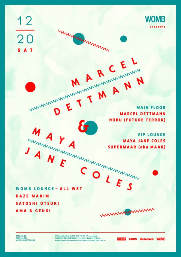 To enhance the night, we’ve also pulled off last minute arrangements for MAYA JANE COLES, who appeared in last year’s FUJI ROCK FESTIVAL, to play in the VIP LOUNGE, from the opening moment to the very last. Not only that, but we’ve also got DAZE MAXIM from Düsseldorf, Germany lined up under the title of ALL WET, appearing in WOMB LOUNGE. This is going to be December’s number one high profile party―and that's no exaggeration!