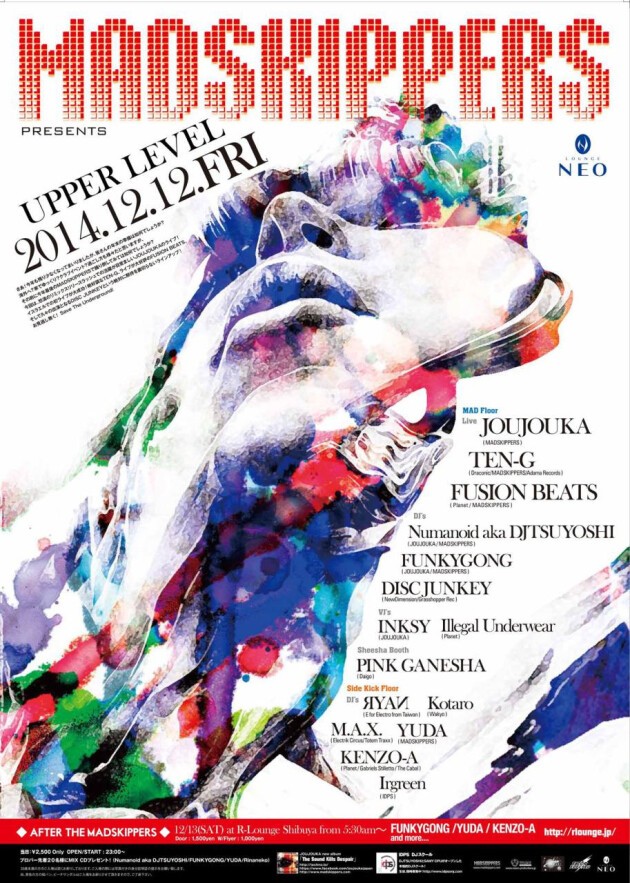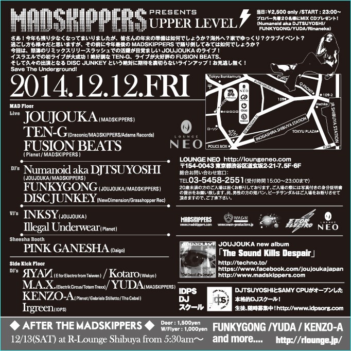 過ごし方も様々だと思いますが、その前に今年最後のMADSKIPPERSで踊り倒してみては如何でしょうか?今回は、怒濤のリミックスリリースラッシュでの活躍が目覚ましいJOUJOUKAのライブ!イスラエルでの初ライブが大成功!絶好調なTEN-G、ライブが大好評のFUSION BEATS、そして久々の出演となるDISC JUNKEYという絶対に期待を裏切らないラインアップ!お見逃し無く!Save The Underground!