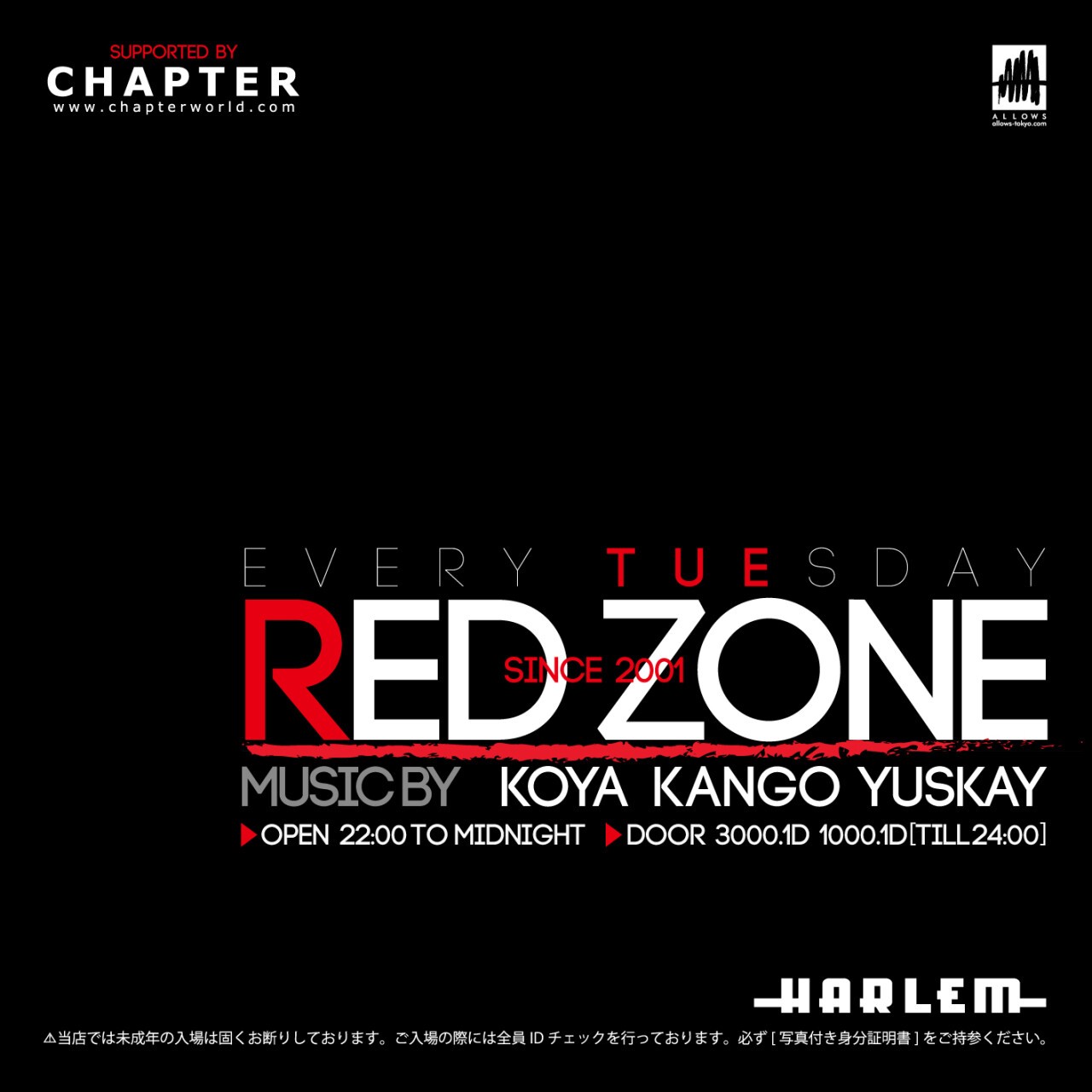 東京発信、世界水準のPARTY "RED ZONE"。最先端の潮流を取り入れながらオリジナルなスタイルを展開し、国内外から広く話題を集める。2001年よりスタートし今年13年目に突入。